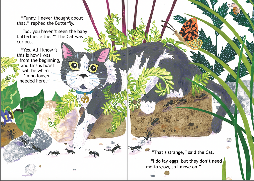 A curious cat wonders why she has never seen any baby butterflies before, and decides to go on a small adventure to find out why, with the help from an equally curious butterfly and a wise old snail.